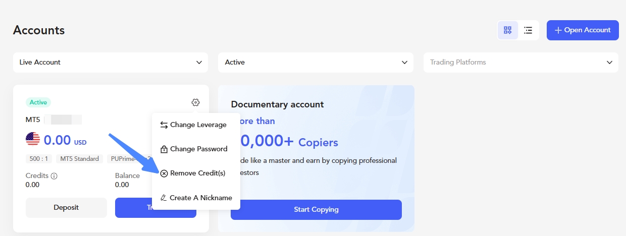 *ملاحظة: إذا كان لديك رصيد داخل الحساب ولكنك غير قادر على إزالته، يرجى التواصل مع فريق الدردشة المباشرة لدينا للمساعدة.