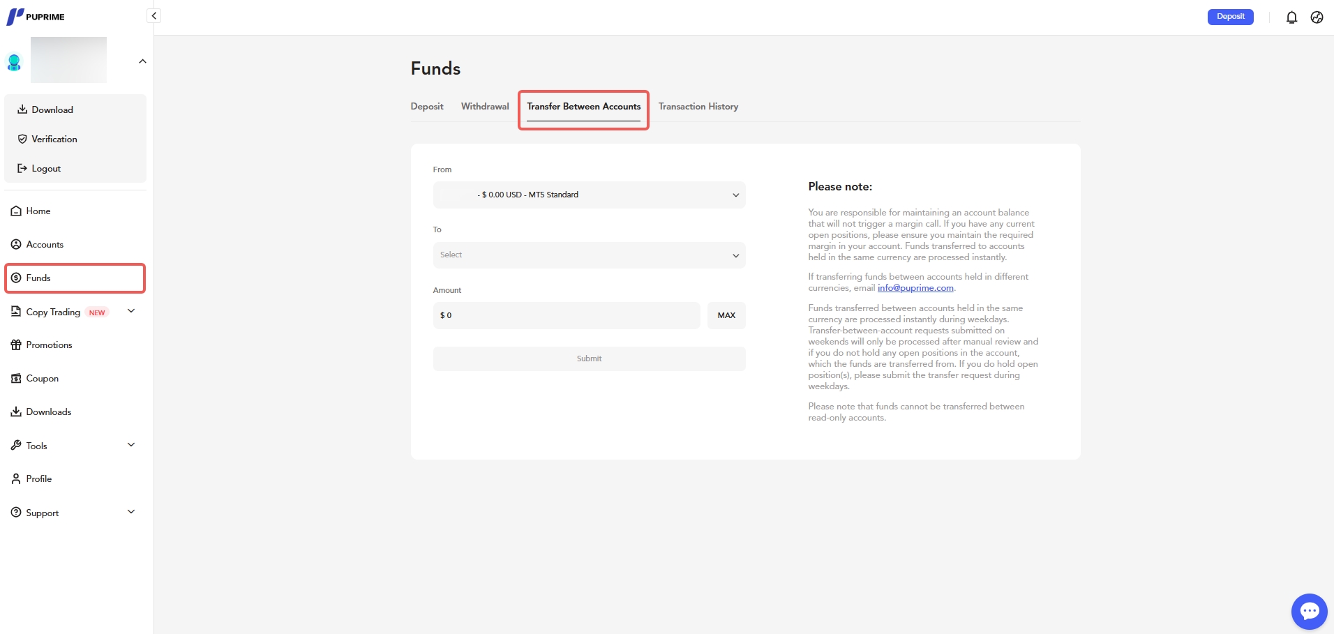 Nach dem Einloggen ins Kundenportal wählen Sie im Dashboard-Menü „FONDS“ und dann „Überweisung zwischen Konten“ aus.