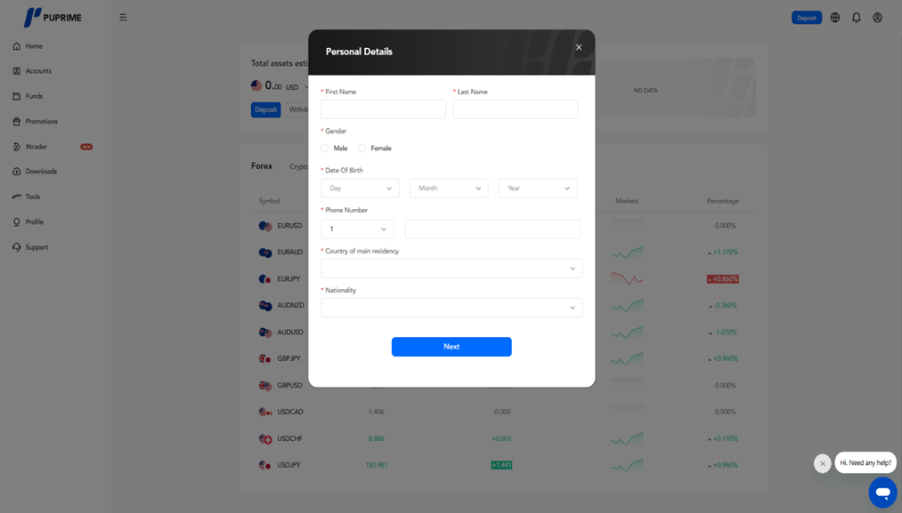 Bitte besuchen Sie die Registrierungsseite von PU Prime über https://www.puprime.com/forex-trading-account/ und füllen Sie die erforderlichen Informationen aus. Nach Abschluss dieses Schritts erhalten die Kunden die Zugangsdaten zum Kundenportal an ihre registrierte E-Mail-Adresse.