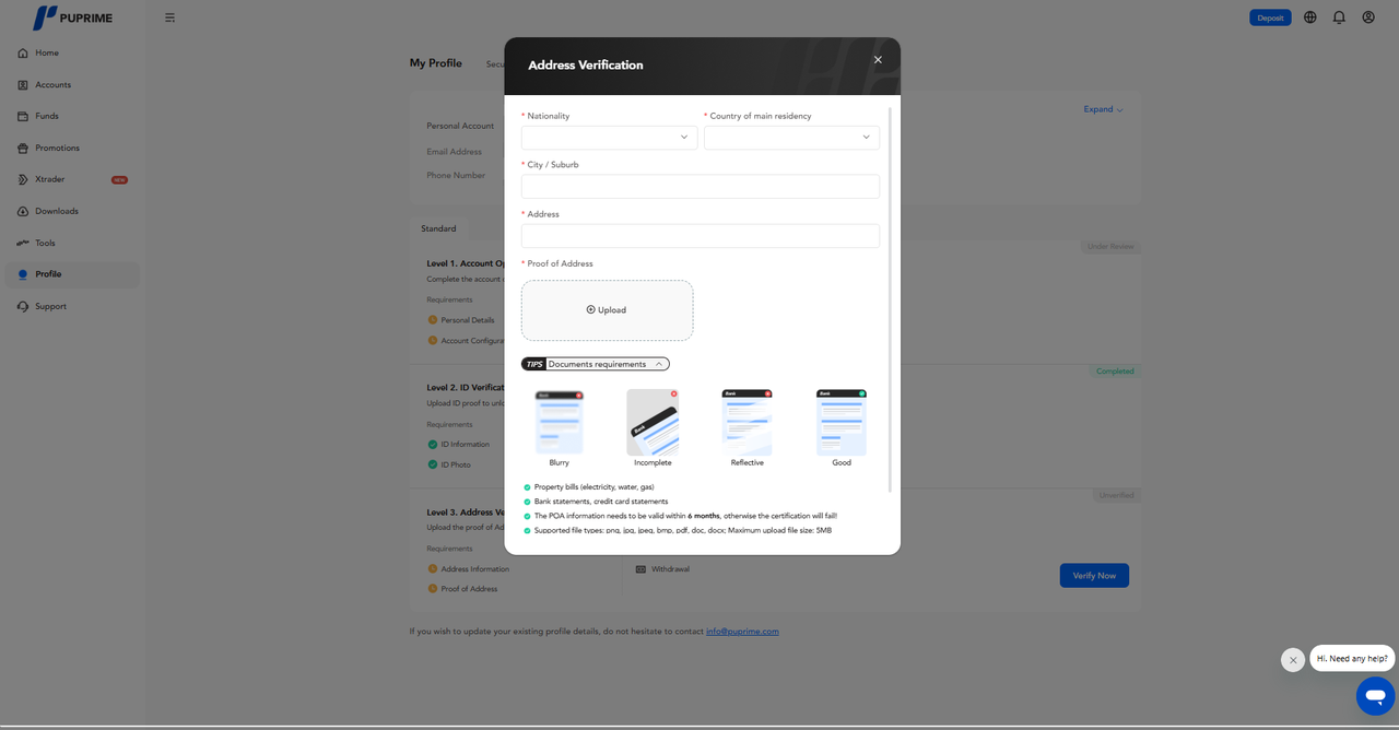 Bezüglich der erforderlichen Dokumente zur Kontoüberprüfung finden Sie weitere Informationen unter diesem Link: https://helpcenter.puprime.com/hc/en-001/articles/6041919161487-What-is-the-account-opening-document-requirement-in-PU-Prime-.
