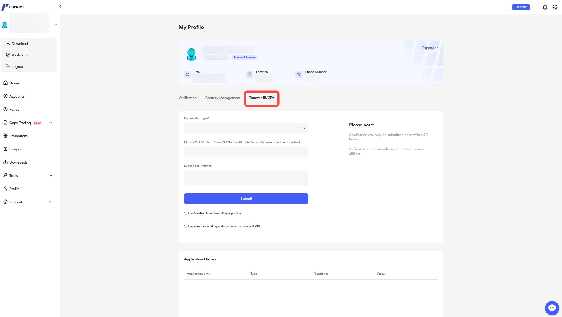 After logging in to the Client Portal, select “Profile” from the dashboard menu, then choose “Transfer IB/CPA.” From there, you can submit a request to link to a new IB/CPA by entering the new IB or CPA ID and specifying the reason for the transfer.