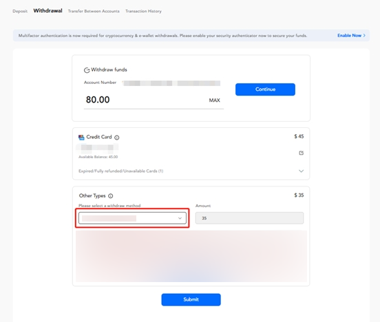 Once you have selected the secondary withdrawal method you would like to use, fill in the details of the corresponding method of withdrawal you have chosen for and click "Submit"