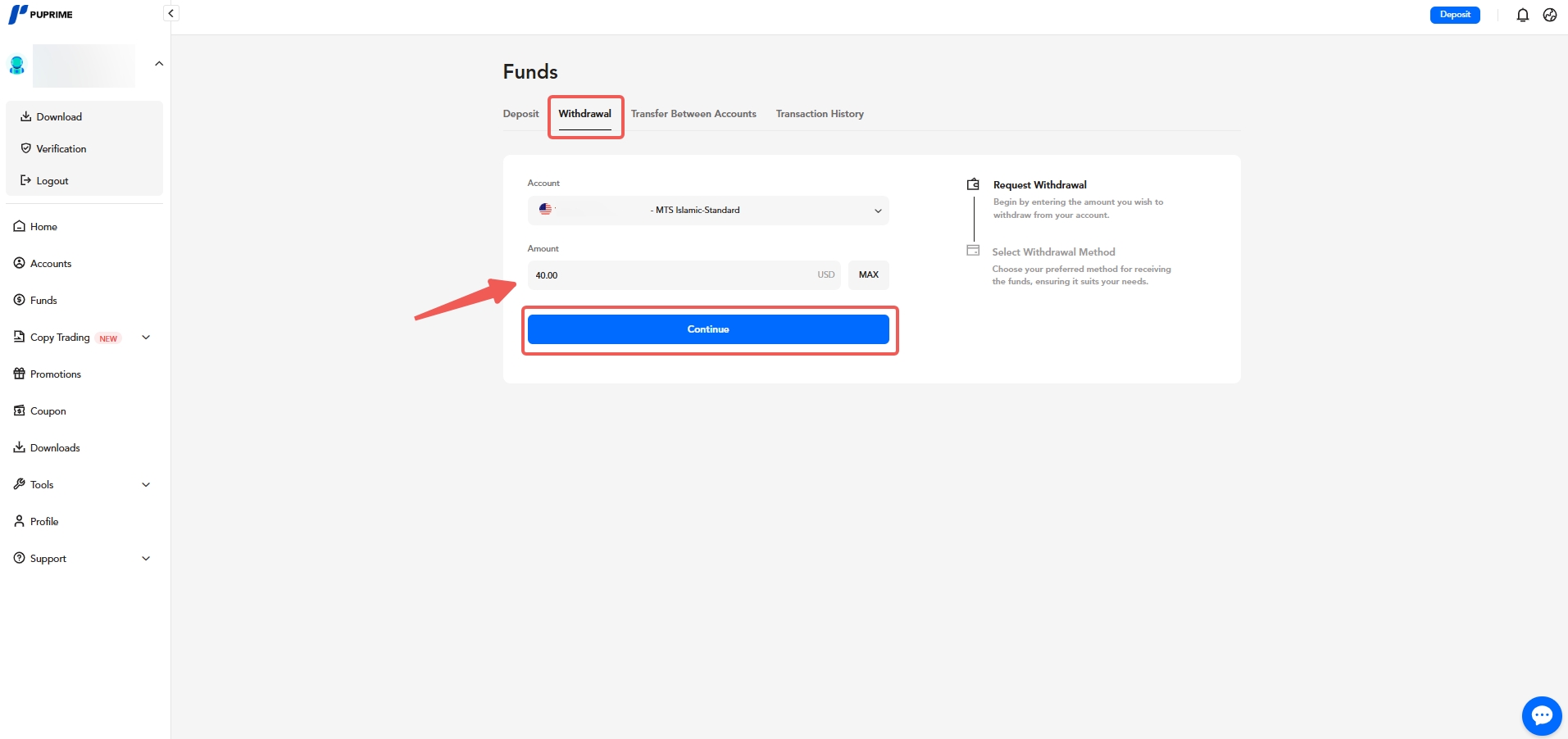Help Center | PU Prime | More Than Trading Deposits and Withdrawals Withdrawals How to withdraw funds via Client Portal? 1. Log in to the Client Portal and go to "Funds". 2. Click "Withdrawal", select the trading account you wish to withdraw from, enter the withdrawal amount, and click "Continue".