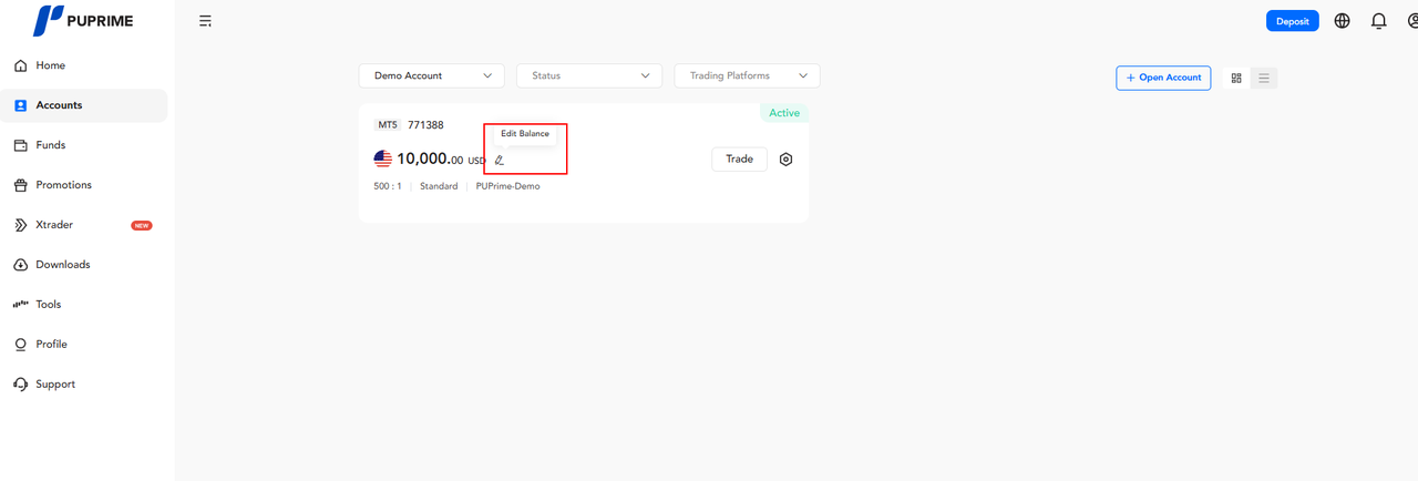 2. Para restablecer el saldo de la cuenta demo, inicia sesión en tu portal de cliente, navega a "Cuenta", selecciona tu cuenta Demo y haz clic en la sección "Editar Saldo".