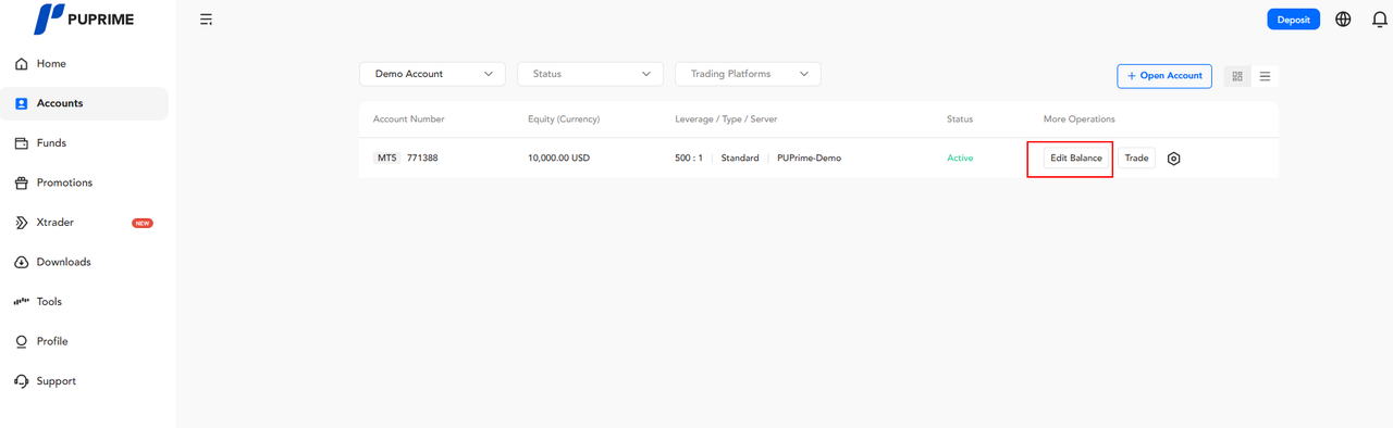2.Upang i-reset ang balanse ng demo account, mag-log in sa iyong client portal, pumunta sa 'Account,' piliin ang iyong Demo account, at i-click ang seksyon na 'Edit Balance'.