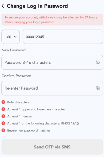 Note : Veuillez noter que les retraits seront indisponibles pendant 24 heures après la modification réussie de votre mot de passe.