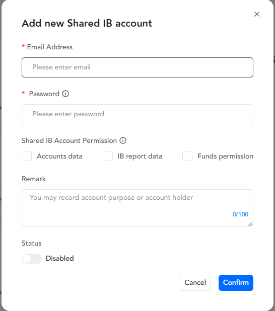 Introducing Broker अपने IB Portal में लॉग इन करने के बाद अपने IB खाते को दूसरों के साथ साझा कर सकते हैं, "IB Profile" पर क्लिक करें। ईमेल पता दर्ज करें और साझा खाते के लिए पासवर्ड सेट करें। Introducing Broker यह चुन सकते हैं कि क्या वे अपने खाता डेटा, IB रिपोर्ट डेटा और फंड्स अनुमतियों को साझा करना चाहते हैं। "Enabled" को टॉगल करके साझाकरण सक्रिय करें, फिर "Confirm" पर क्लिक करें।