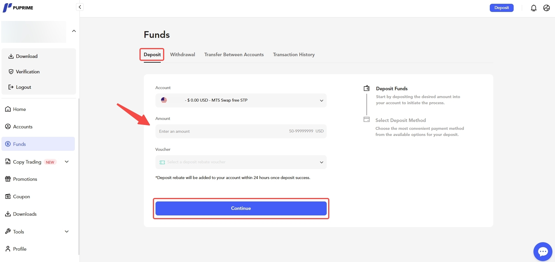 2. "Deposit" पर क्लिक करें, वह ट्रेडिंग खाता चुनें जिसे आप फंड करना चाहते हैं, जमा राशि दर्ज करें, और "Continue" पर क्लिक करें।