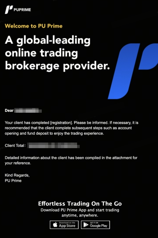 इंट्रोड्यूसिंग ब्रोकर्स (IBs) को उनके क्लाइंट्स की प्रगति की जानकारी देने के लिए, PU Prime IB पोर्टल के माध्यम से स्वचालित ईमेल सूचनाएँ प्रदान करता है, जब कोई आमंत्रित क्लाइंट प्लेटफॉर्म पंजीकरण सफलतापूर्वक पूरा करता है और एक ट्रेडिंग खाता खोलता है।