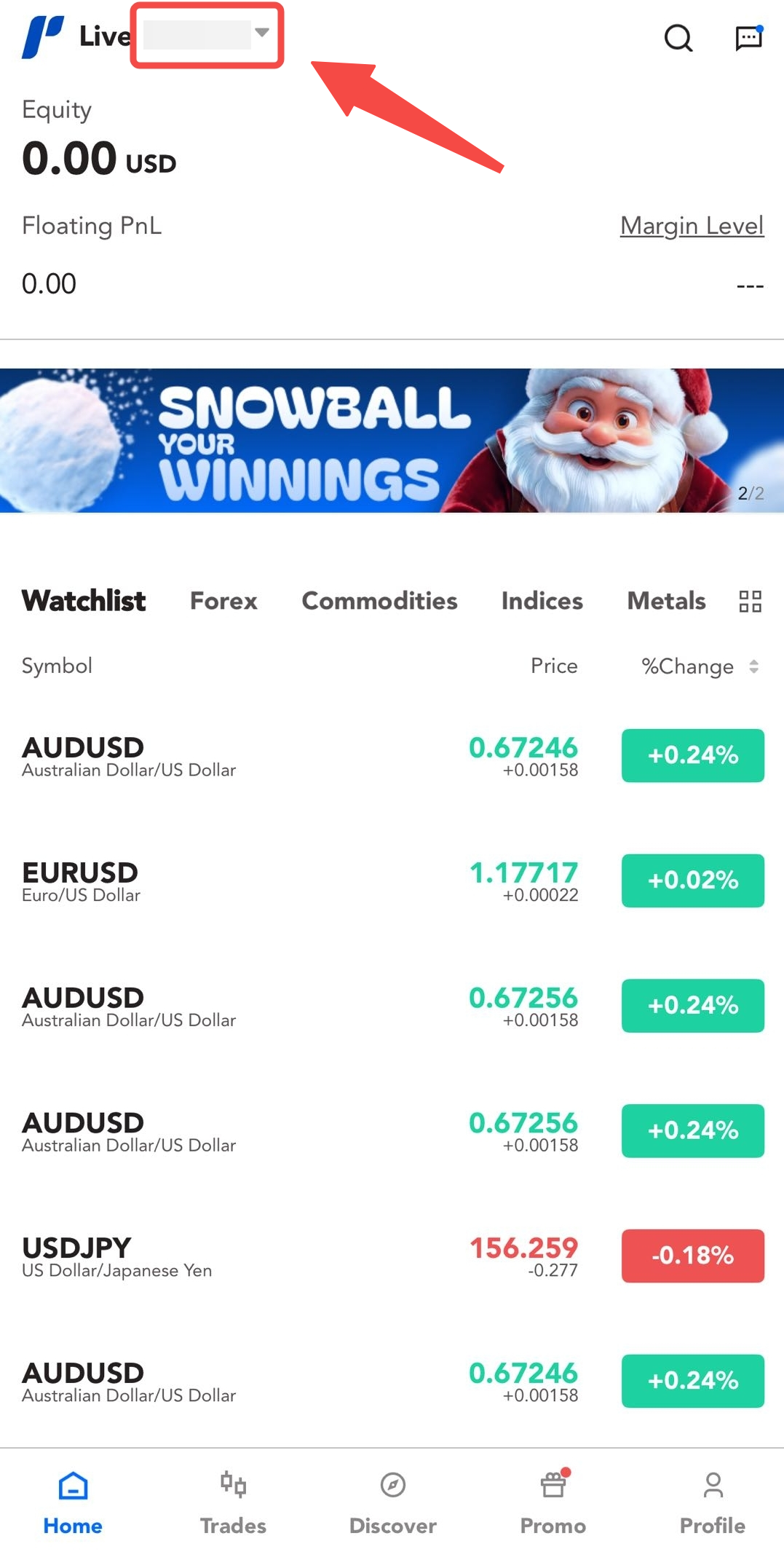 - पेज के शीर्ष पर अपने ट्रेडिंग अकाउंट नंबर के बगल में स्थित ड्रॉपडाउन तीर पर क्लिक करें।