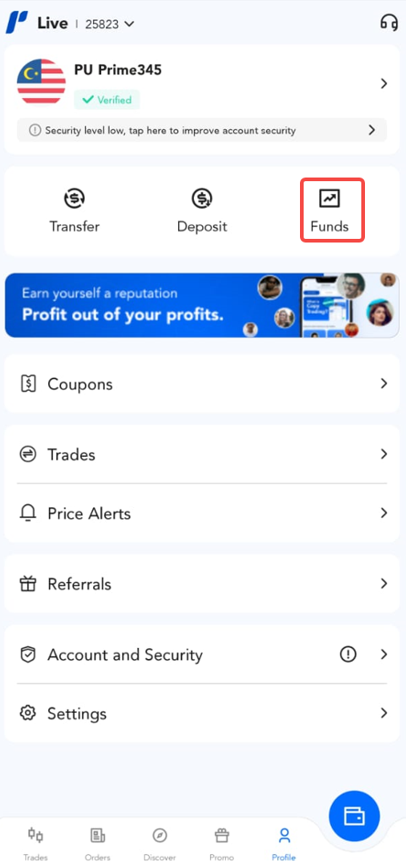 Help Center | PU Prime | More Than Trading PU Prime ऐप PU Prime APP पूछताछ PU Prime ऐप में पैसे कैसे निकाले? 1. "Profile" बटन पर क्लिक करें। 2. "Funds" बटन पर क्लिक करें। 3. "Withdraw" पर क्लिक करें ताकि आपके निकासी अनुरोध के साथ आगे बढ़ सकें। 4. अपना खाता और निकासी राशि चुनें और "Next" पर क्लिक करें।