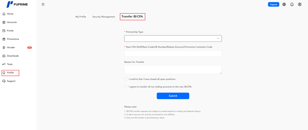 Setelah masuk ke portal klien, pilih opsi "Profil" dari menu dashboard, kemudian pilih "Transfer IB/CPA." Anda sekarang dapat meminta untuk menghubungkan IB/CPA, memberikan ID CPA baru, dan menyebutkan alasan untuk transfer tersebut.