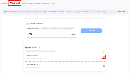 Sesuai dengan regulasi anti-pencucian uang, jika Anda sebelumnya telah melakukan deposit menggunakan kartu kredit, Anda perlu menarik jumlah yang telah Anda depositkan dengan kartu tersebut menggunakan kartu yang sama. Oleh karena itu, kartu kredit yang dapat Anda tarik akan dipilih secara otomatis. Namun, jika kartu kredit tersebut sudah tidak digunakan lagi karena berbagai alasan, Anda memiliki opsi untuk mengarsipkan kartu kredit tersebut.