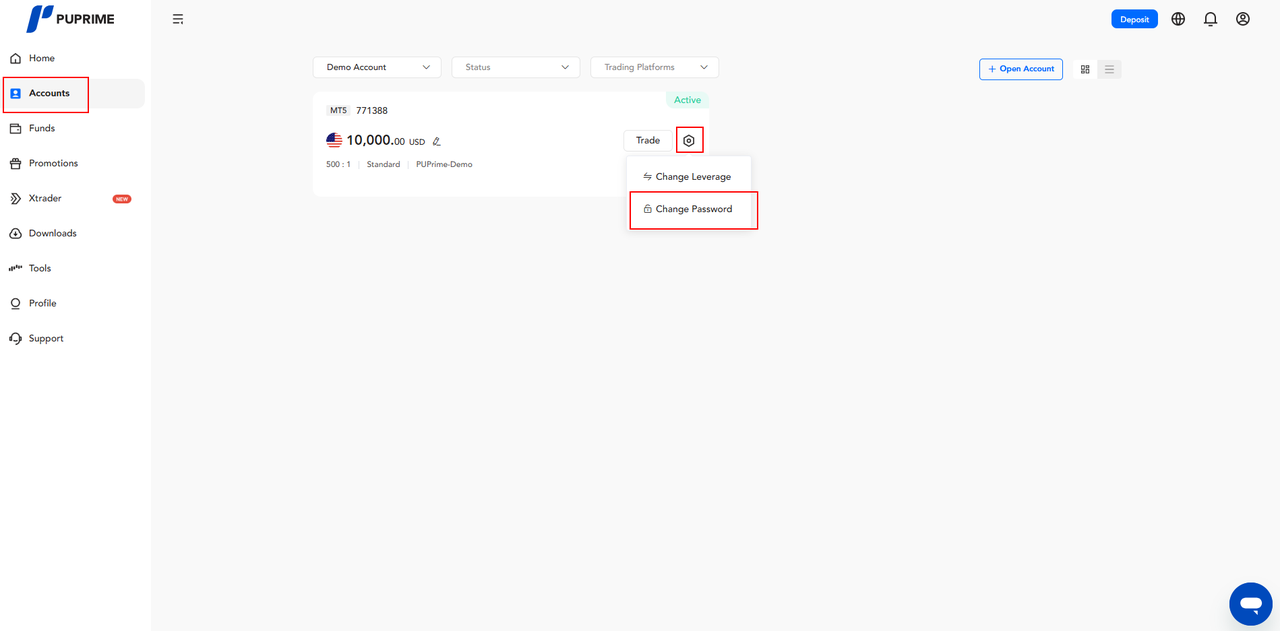 i) Untuk mengatur ulang kata sandi akun demo Anda, masuk ke portal klien Anda, navigasikan ke 'Account,' pilih akun Demo Anda, dan klik tombol di bagian 'Change Password'. Kemudian, pilih 'Forgot Password,' dan detail login baru akan dikirim ke alamat email yang terdaftar.