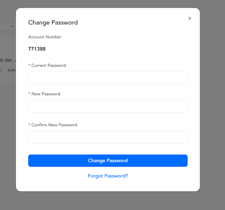 ii)Untuk mengubah kata sandi akun demo Anda, masuk ke portal klien Anda, arahkan ke 'Account,' pilih akun Demo Anda, dan klik tombol di bagian 'Change Password'. Kemudian, masukkan kata sandi saat ini diikuti dengan kata sandi baru Anda.