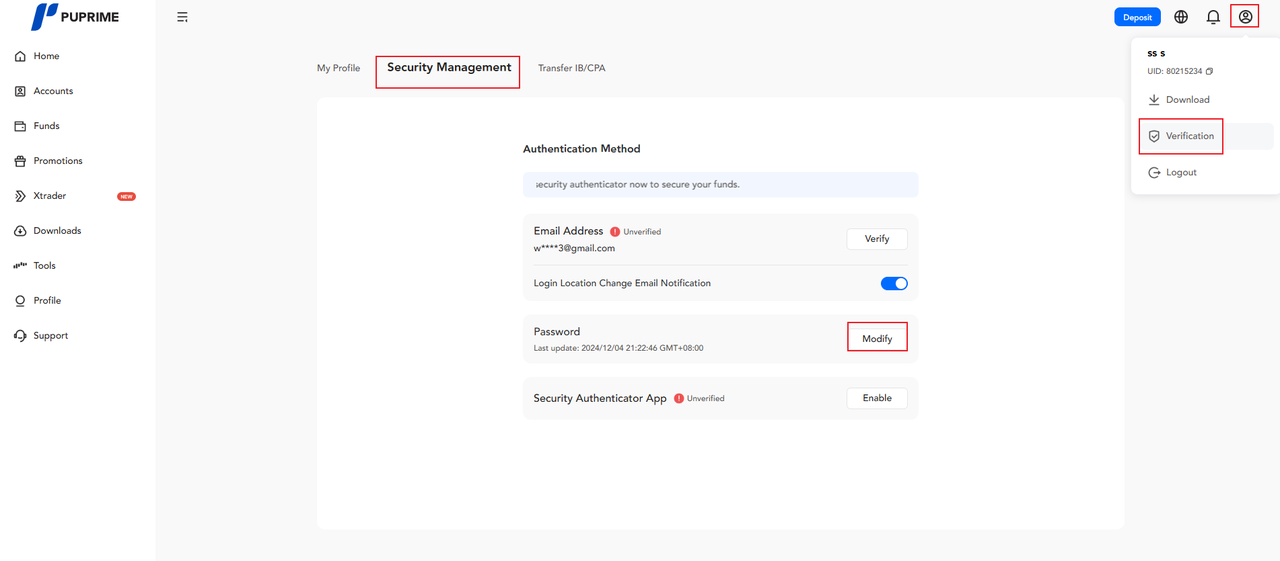 Setelah masuk ke portal klien, arahkan ke sudut kanan atas halaman dan pilih "VERIFICATION" lalu pilih "Security Management".