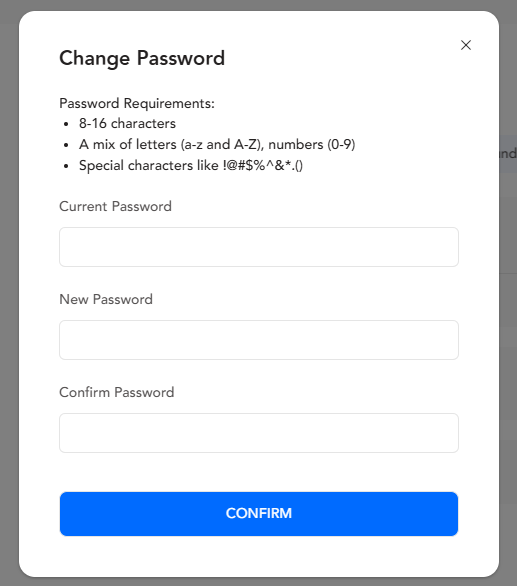 Klien diharuskan memasukkan kata sandi saat ini dan membuat kata sandi baru berdasarkan persyaratan kata sandi. Pilih "Confirm" untuk menyelesaikan perubahan kata sandi.
