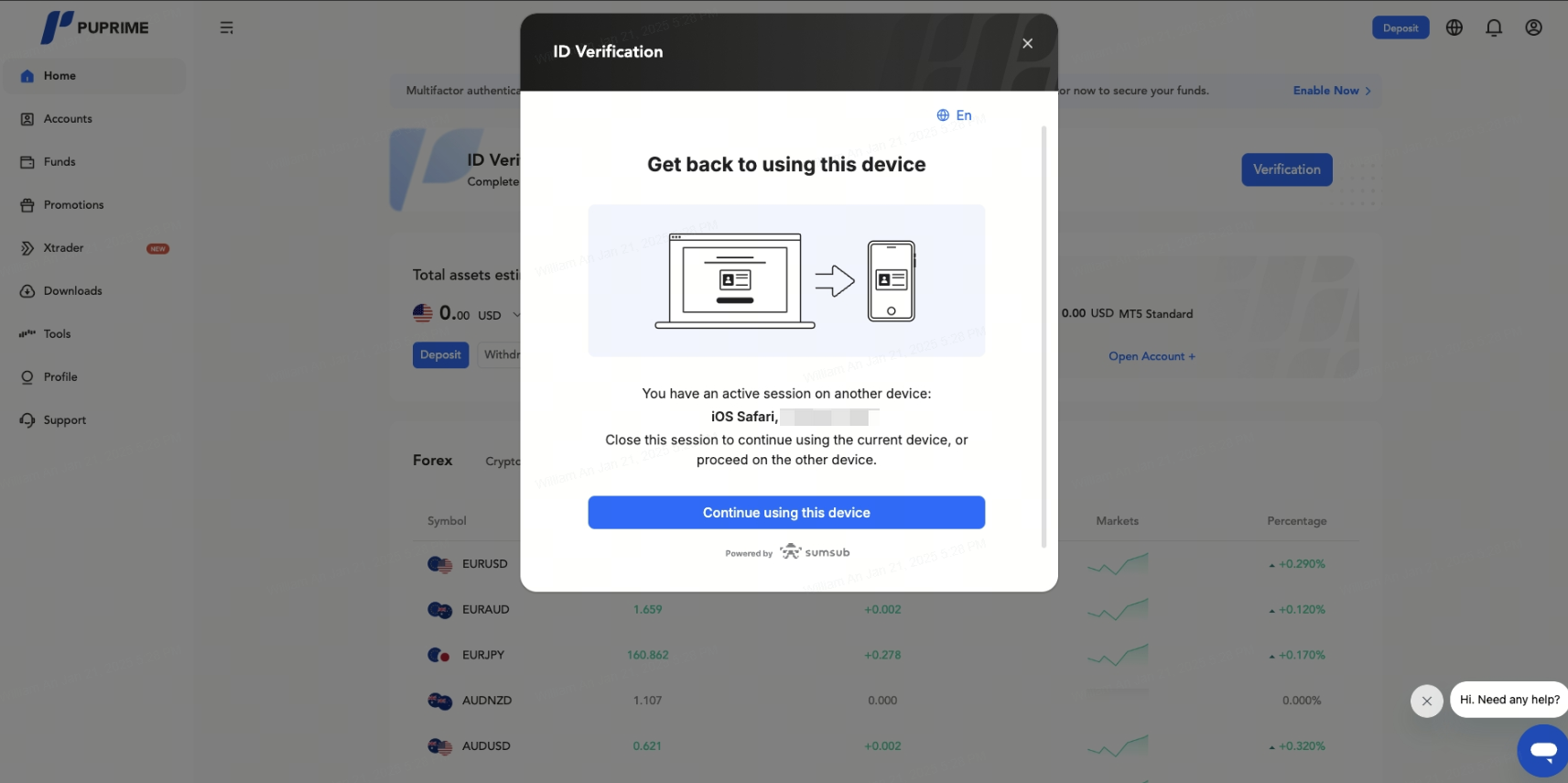 Di bagian "Verifikasi Identitas", Anda dapat memilih untuk melanjutkan di perangkat saat ini atau “Lanjutkan di ponsel”. *Lanjutkan di ponsel Anda dapat memindai QR code dengan kamera ponsel Anda atau menyalin tautan ke browser ponsel Anda untuk melanjutkan dengan Verifikasi ID. Catatan: Setelah Anda memilih lanjutkan di telepon, sebuah jendela akan muncul menunjukkan bahwa Anda memiliki sesi aktif di telepon atau perangkat lain pada sesi desktop.