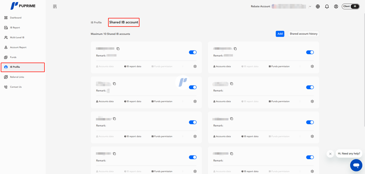 - IBレポートデータ:IBデータページを表示します(ダッシュボード、マルチレベルIB - アカウント)。許可がない場合、データは非表示になります。