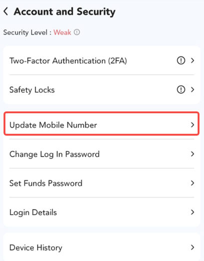 Help Center | PU Prime | More Than Trading PU Prime App PU Prime APPに関するお問い合わせ PU Primeアプリで携帯番号を更新するには? 1. 「プロフィール」ボタンをクリックしてください。 2. 「アカウントとセキュリティ」をクリックします 3. 「携帯電話番号の更新」ボタンをクリックしてください。 4. 新しい連絡先番号と現在のパスワードを入力してください。注意:パスワードの変更が成功した後、48時間は出金が利用できなくなりますのでご注意ください。 5. 「SMSでOTPを送信」をクリックし、OTPを入力してください。完了すると、お客様の連絡先番号が正常に変更されます。