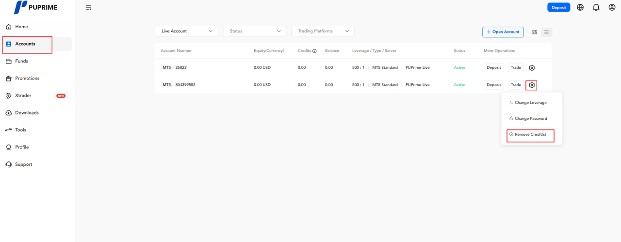 Help Center | PU Prime | More Than Trading 계정 관리 클라이언트 포털 내 계좌에 크레딧이 존재할 경우 자금을 어떻게 이체하나요? 크레딧 보너스가 있는 계좌는 내부 이체가 불가능합니다.크레딧을 제거하려면 대시보드 메뉴에서 "계좌관리" 를 클릭한 후 버튼을 선택합니다. 그러면 "크레딧 제거" 메뉴가 표시됩니다. 제거할 크레딧 금액을 확인합니다. 크레딧이 성공적으로 제거되면 대시보드 메뉴에서 "자금"을 클릭한 후 "자금 이체"를 선택하여 내부 이체를 진행할 수 있습니다. *참고: 크레딧을 제거할 수 없는 경우, 라이브 채팅 또는 고객 지원팀에 문의하시기 바랍니다.