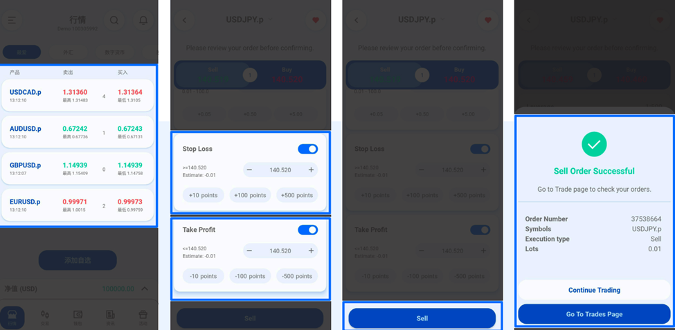 Krok 4: Pojawi się okno dialogowe, aby potwierdzić Twoje zamówienie. Wybierz albo "Continue Trading", aby przejść do głównej strony Markets, albo wybierz "Go To Trades Page", aby zobaczyć swoje otwarte pozycje.