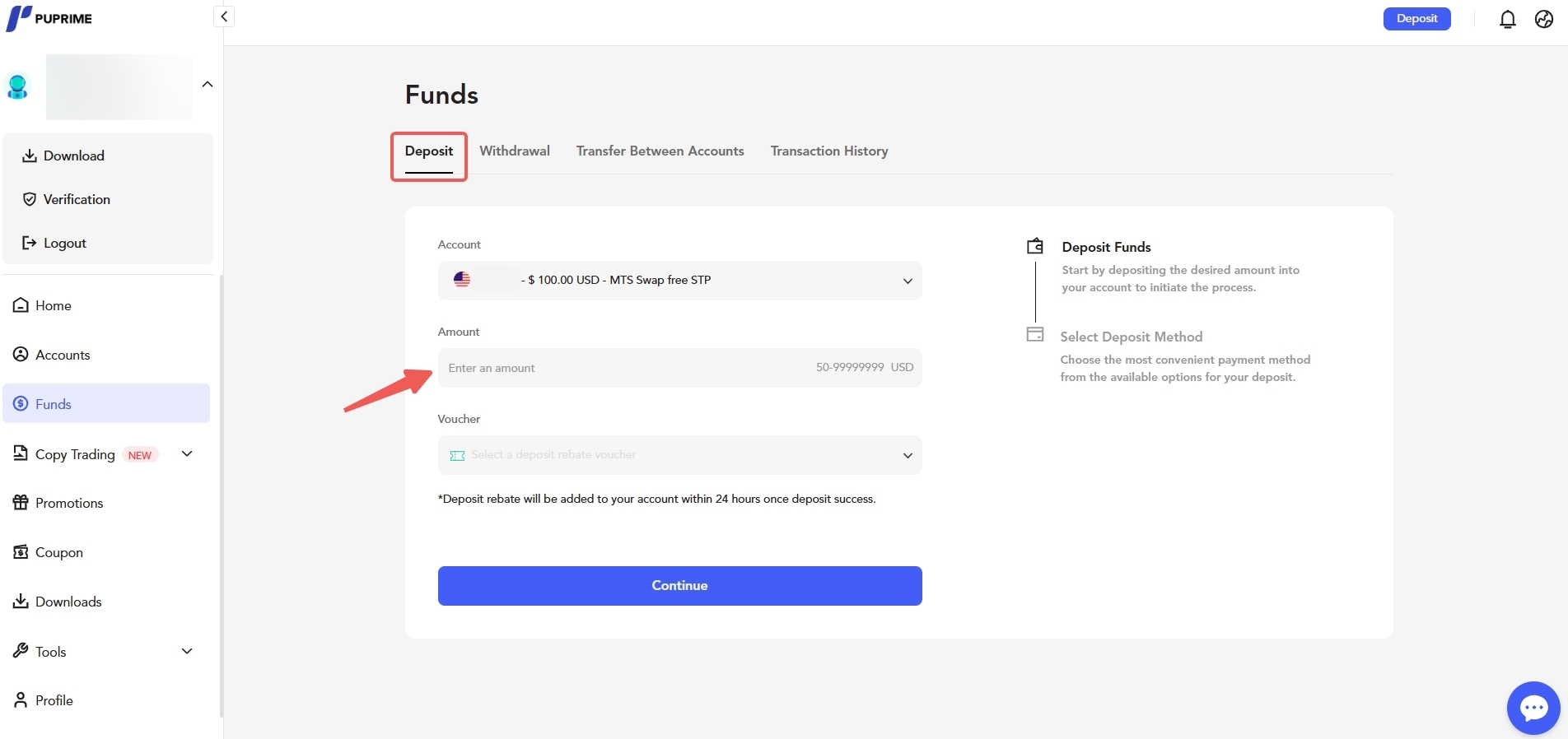 2. Clique em “Depositar” e insira o valor que deseja depositar, depois clique em “Continuar.”