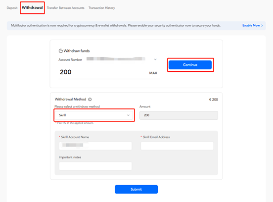 Escolha o e-wallet correspondente (Skrill/Neteller/Bitwallet/Sticpay/Astropay/Perfect Money/AirTM) na seção inferior de "Método de Retirada" e clique em "Enviar".