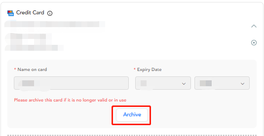 Para arquivar o cartão de crédito, na página de "Retirada", após inserir o valor da retirada, o cartão de crédito aparecerá. Clique no botão exibido abaixo para arquivar o cartão de crédito.