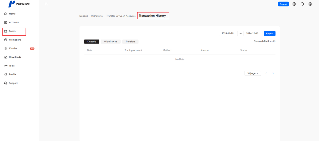 Após fazer login no portal do cliente, selecione "FUNDOS" no menu do painel e, em seguida, escolha "Histórico de Transações" para visualizar suas transações de depósito, saque e transferência.