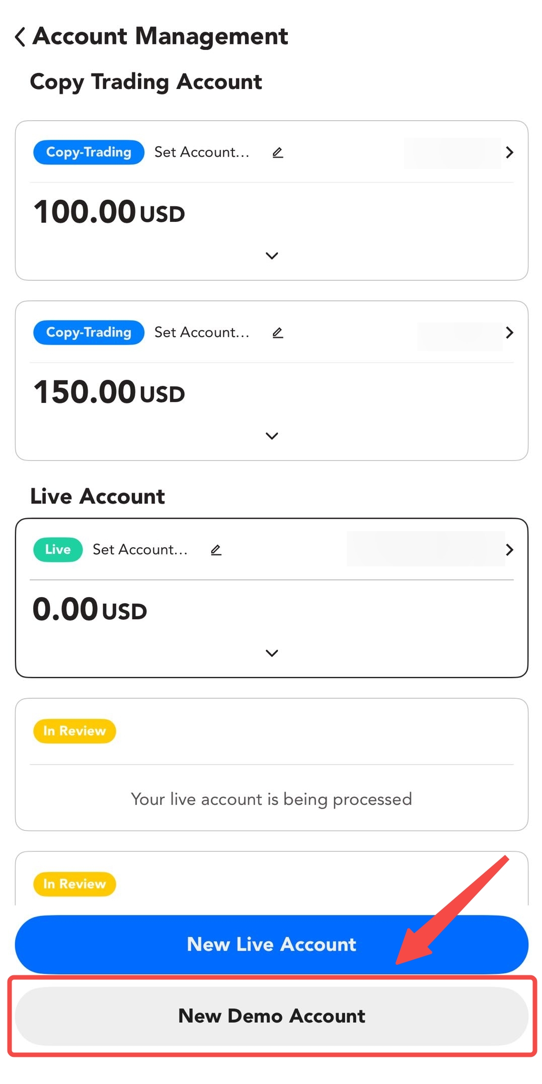 - Clique na seta suspensa localizada ao lado do número da sua conta de negociação no topo da página.