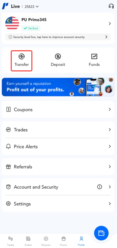Help Center | PU Prime | More Than Trading приложении PU Prime Запрос приложения PU Prime Как выполнить перевод средств в приложении PU Prime? 1. Нажмите на кнопку "Profile". 2. Нажмите на кнопку "Transfer". 3. Введите данные для перевода средств и нажмите "Далее", чтобы продолжить перевод средств.