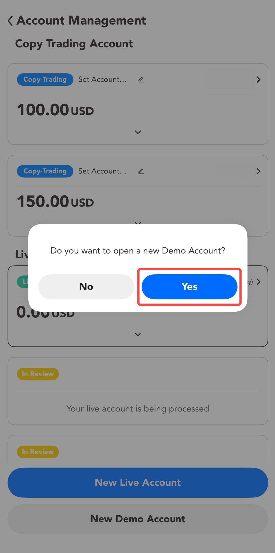 - Появится окно подтверждения. Выберите «Да», чтобы продолжить открытие нового демонстрационного аккаунта.