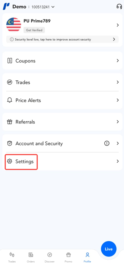 Help Center | PU Prime | More Than Trading PU Prime App สอบถามแอป PU Prime จะเปลี่ยนภาษาในแอป PU Prime ได้อย่างไร? 1. คลิกที่ปุ่ม "โปรไฟล์" 2. คลิกที่ “ตั้งค่า” 3. คลิกที่ปุ่ม “ภาษา” 4. เลือกภาษาที่คุณต้องการเพื่อเปลี่ยนภาษาของแอปพลิเคชัน