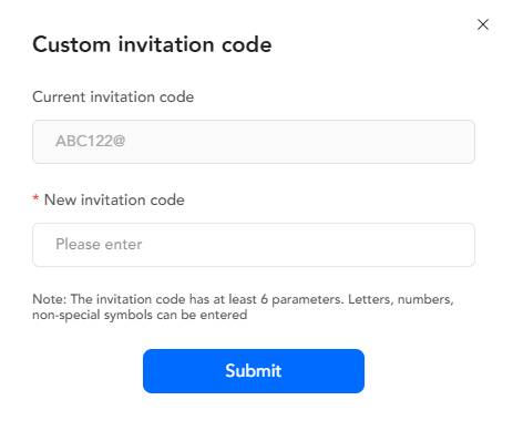 - IB có thể tùy chỉnh Mã Mời Khuyến mãi của họ thành Mã Mời ưa thích của họ (Chỉ có thể nhập chữ cái, số, ký tự không đặc biệt)