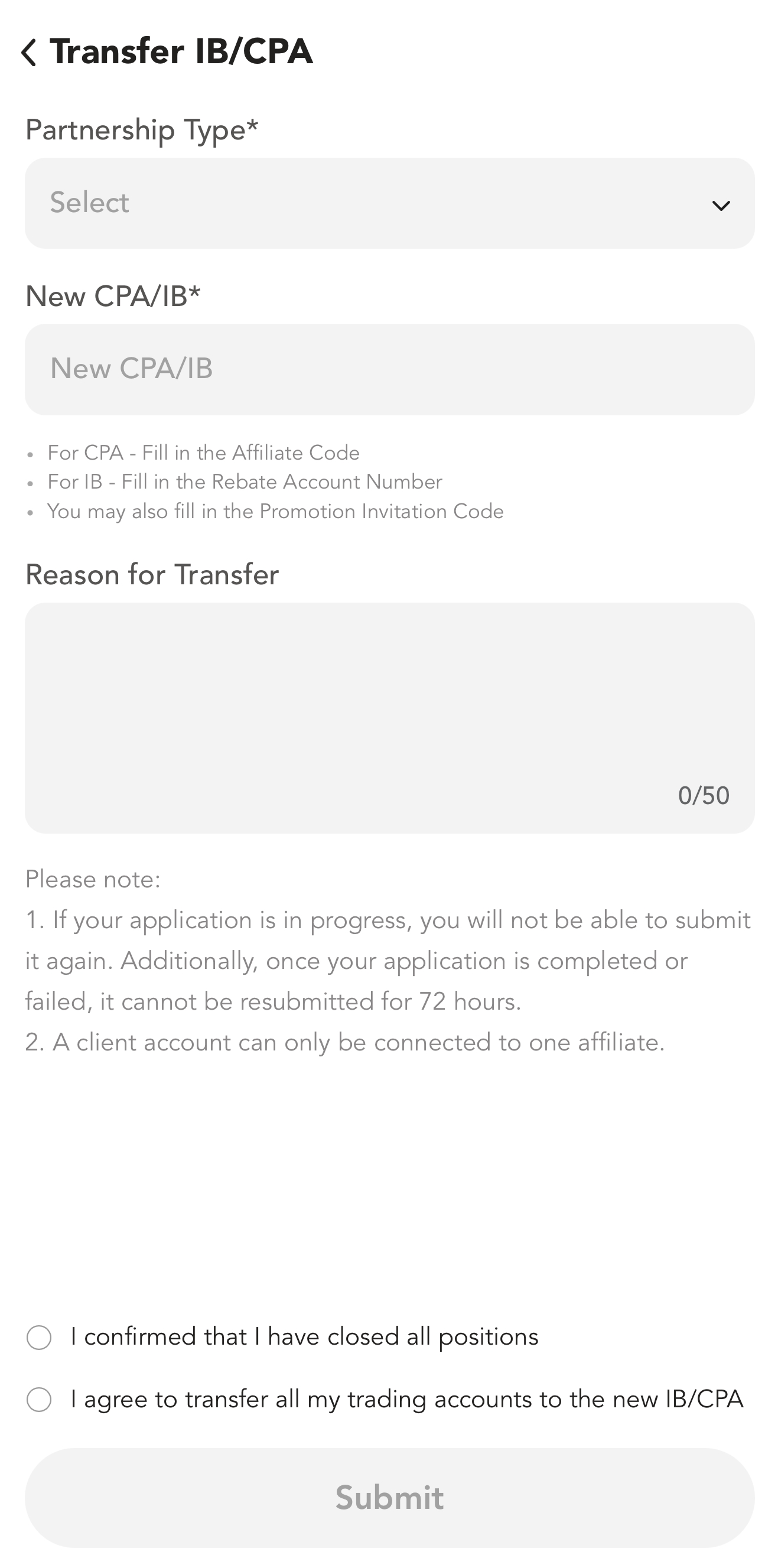 - Điền các thông tin cần thiết, bao gồm loại hình hợp tác, mã affiliate CPA/IB hoặc số tài khoản rebate, và lý do chuyển.