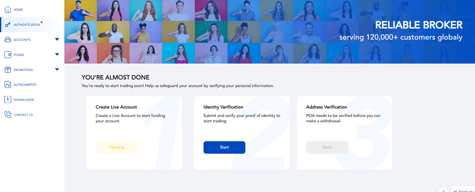 Để truy cập Cổng thông tin Khách hàng của bạn, nhấp vào tùy chọn "Đăng nhập Cổng thông tin Khách hàng". Sau khi đăng nhập, điều hướng đến phần "XÁC THỰC" trên trang chủ, và bắt đầu nộp các tài liệu cần thiết bằng cách chọn "Bắt đầu."