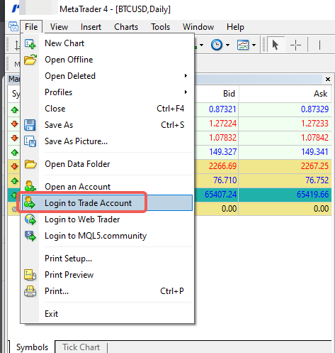 Once you have your account number and password, simply install the MT4/MT5 platform on your computer and select 'File', then select 'Login to Trading Account'.