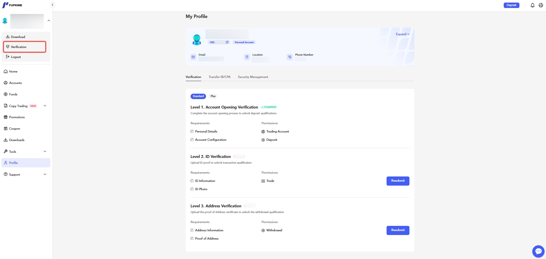 登录后,导航至主页的“Verification”部分,并通过选择“Submit”按钮开始提交所需文件。