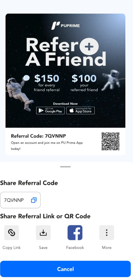 帮助中心 | PU Prime | More Than Trading PU Prime App PU Prime APP 咨询 如何在 PU Prime 应用中推荐朋友? 1. 点击“Profile”按钮。 2. 点击“Referrals”按钮。 3. 点击“立即邀请朋友”。 4. 复制并分享您的推荐码或QR码。