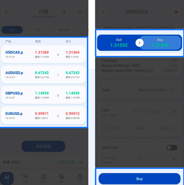 在您的“行情”选项卡上,点击您希望交易的产品。
