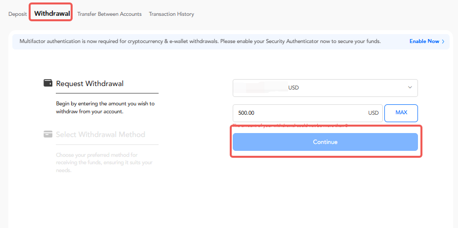 - 輸入您要提現的金額,然後點擊「繼續」。